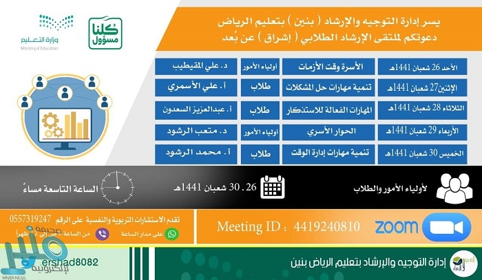 من جهته بين مدير إدارة التوجيه والإرشاد الطلابي الأستاذ عبدالرحمن السبيّل أن لقاءات البرنامج وأنشطته ستنطلق يوميًا عند الساعة التاسعة مساء وعلى مدى خمسة أيام عبر برنامج « zoom » , مشيرًا إلى أنه سيقام في اليوم الأول لقاء للدكتور علي المقيطيب مع لأولياء الأمور بعنوان ” الأسرة وقت الأزمات “, وفي اليوم الثاني ورشة بعنوان ” تنمية مهارات حل المشكلات” للطلاب يقدمها الأستاذ علي الأسمري, أما في اليوم الثالث فيقدم الأستاذ عبدالعزيز السعدون للطلاب ورشة ” المهارات الفعالة للاستذكار”, فيما يلتقي في اليوم الرابع الدكتور متعب الرشود أولياء الأمور في لقاء بعنوان ” الحوار الأسري “, و يختتم البرنامج بدورة ” تنمية مهارات إدارة الوقت ” للطلاب من تقديم الأستاذ محمد الرشود.
