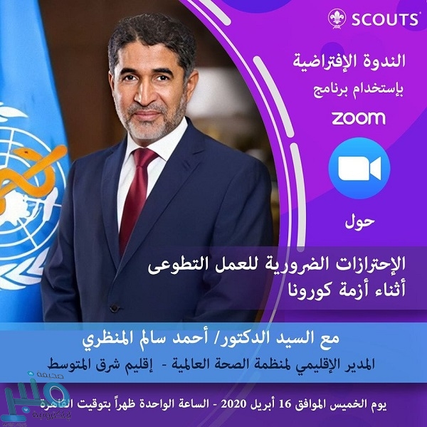 يعقد مكتب الإقليم الكشفي العربي -المنظمة الكشفية العربية-، يوم غداً الخميس ندوة افتراضية بالتعاون مع المكتب الإقليمي لمنظمة الصحة العالمية لشرق المتوسط في موضوع (الاحترازات الضرورية للعمل التطوعي أثناء أزمة كورونا).
