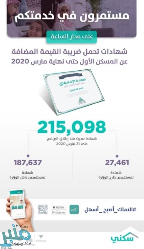 أعلن برنامج سكني التابع لوزارة الإسكان إصدار 215,098 شهادة تحمل لضريبة القيمة المضافة عن المسكن الأول للمواطنين الذين تقدموا على البوابة الإلكترونية (اضغط هنا https://vat.housing.sa/)، وذلك منذ إطلاق المبادرة وحتى نهاية شهر مارس الماضي 2020 وفق تقرير برنامج “سكني” الشهري، الذي صدر مؤخراً والمتضمن مستجدات مبادرة تحمل الدولة ضريبة القيمة المضافة.