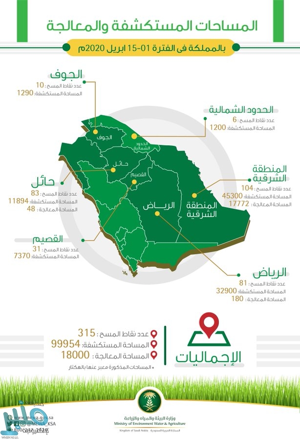 ففي منطقة الرياض، أكدت الوزارة أن عدد النقاط التي تم مسحها بالمنطقة بلغت 81 نقطة وأن المساحة المستكشفة 32900 هكتار، والمساحة التي تمت معالجتها من الآفة بلغت 180 هكتاراً، مبينة أن عدد النقاط التي تم مسحها بالمنطقة الشرقية بلغت 104 نقاط، وأن المساحة المستكشفة هناك بلغت 45300 هكتار، فيما تمت معالجة ما مساحته 17772 هكتاراً.