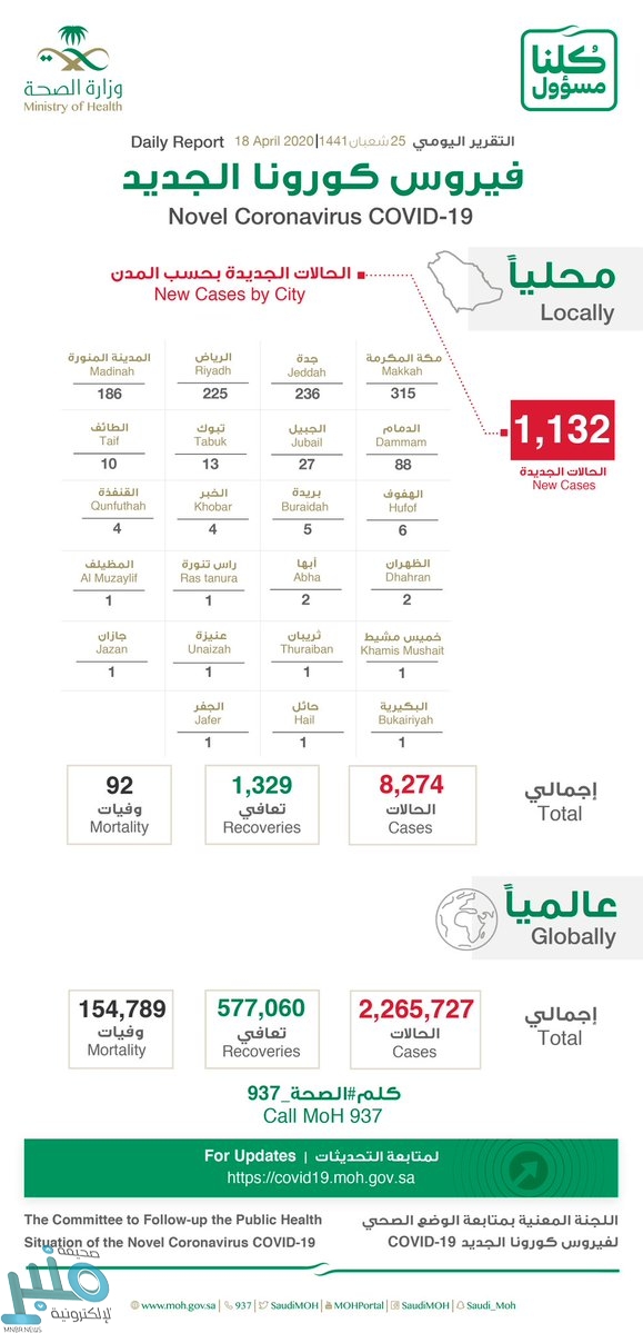وجاء توزيع الإصابات الجديدةبحسب المدن كالآتي: ( مكة المكرمة 315، جدة 236، الرياض 225، المدينة المنورة 186، الدمام 88، الجبيل 27، تبوك 13، الطائف 10، الهفوف 6، بريدة 5، الخبر 4، القنفذة 4، أبها 2، الظهران 2، وحالة واحدة في كل من “عنيزة، البكيرية، حائل، ثريبان، المظيلف، بيشة، خميس مشيط، جازان، الجفر)