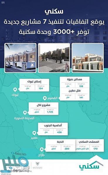 وتستهدف الاتفاقيات الموقعة إنشاء مشاريع سكنية متكاملة من حيث البنية التحتية والمرافق الخدمية، حيث شملت التوقيع مع شركة “سماسمة ” وذلك لتنفيذ 1725 وحدة سكنية من نوع شقة في مشروع “تلال” بحي الجصة جنوب المدينة المنورة، وشركة “الكبريش للاستثمار والمقاولات” لبناء 170 وحدة سكنية من نوع فيلا وتاون هاوس في مشروع “الممشى السكني” في محافظة أبو عريش، وشركة “المنجوف” لتنفيذ مشروع “النخبة” في جيزان الذي يضم 280 وحدة سكنية من نوع شقة، إضافة إلى التوقيع مع شركة “أندلسية الجنوب” لبناء 436 فيلا بحي الضيافة في خميس مشيط، وشركة “شار العقارية” لبناء مشروع “إسكان تبوك” الواقع شرق وادي دمج الذي يوفر 154 فيلا، وشركة “فضاء الاستثمار” لبناء 141 فيلا في مدينة بريدة، وشركة “عنان العقار” لبناء 138 فيلا بعنيزة.
