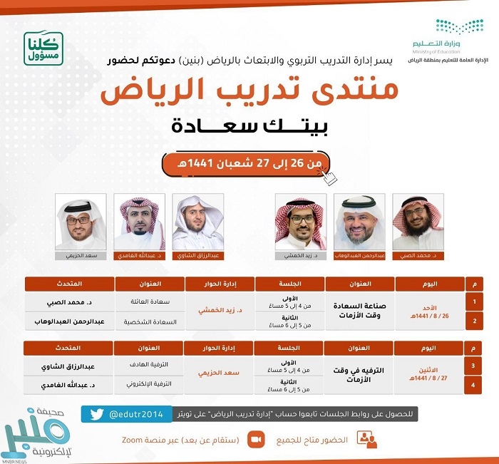 أطلقت الإدارة العام للتعليم بمنطقة الرياض “منتدى تدريب الرياض” الذي سيقام عن بعد عبر منصة برنامج “زوم” والذي يأتي انطلاقا من مسؤوليتها الاجتماعية تجاه الأسرة والمجتمع ويقدمها نخبة من المدربين والمستشارين المعروفين.