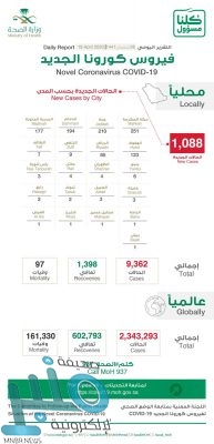 وجاء توزيع الحالات الـ 1088 المصابة بحسب المدن كالآتي : (مكة المكرمة 251، جدة 210، الدمام 194، المدينة المنورة 177، الهفوف 123، الرياض 85، الزلفي 9، الطائف 7، ينبع 6، الظهران 4، حائل 4، رأس تنورة 3، عنيزة 3، الجبيل 3، تبوك 2، رابغ 2، الباحة 1، محايل عسير 1، الخرج 1، العيص 1، بيش 1).