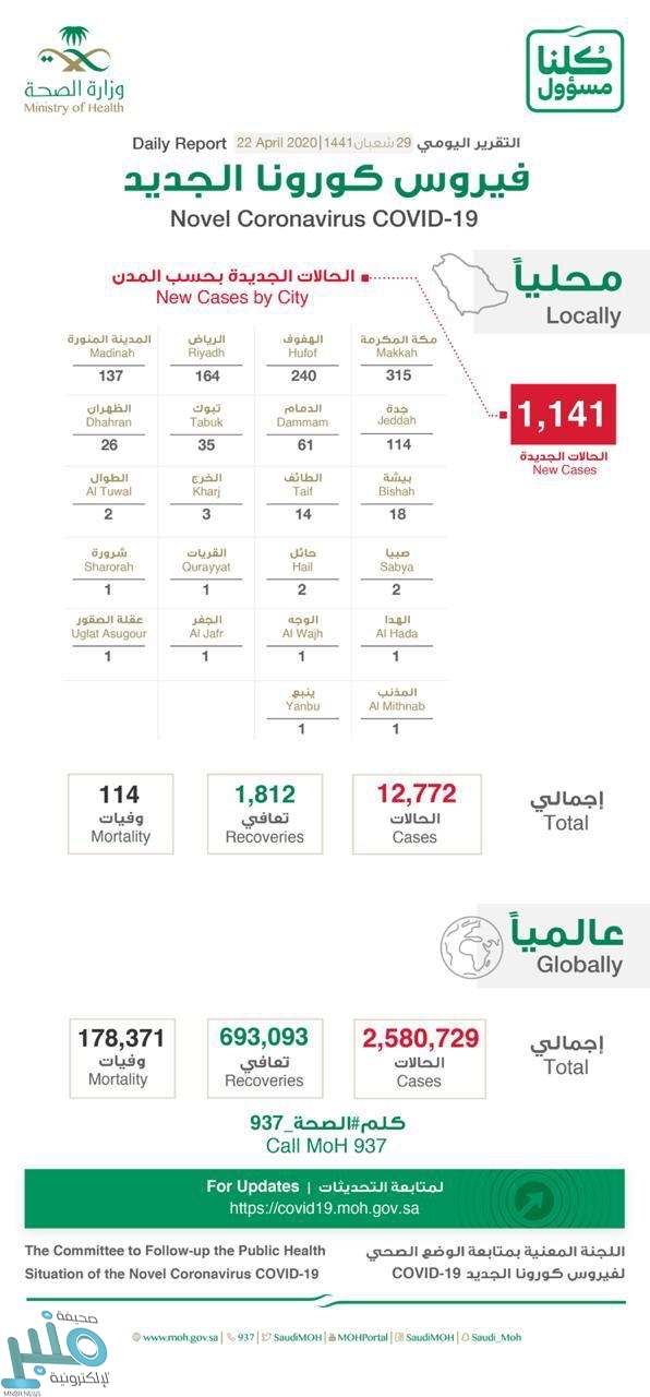 وأشار “متحدث الصحة”، إلى تسجيل 5 وفيات جديدة في المملكة، ليصل إجمالي الوفيات إلى 114 حالة، فيما تعافت 172 حالة، ليصل مجموع المتعافين إلى 1812 حالة”.