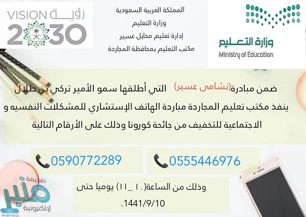 ضمن مبادرة (نشامى عسير) والتي أطلقها صاحب السمو الملكي الأمير تركي بن طلال بن عبدالعزيز أمير منطقة عسير _حفظه الله _ للحد من تفشي جائحة كورونا وضمن المبادرات المجتمعية لمحافظة المجاردة وبإشراف ومتابعة سعادة محافظ المجاردة الأستاذ سعيد بن علي بن دلبوح ومتابعة منسق مبادرات محافظة المجاردة الأستاذ علي حنفان العمري قام مكتب التعليم بمحافظة المجاردة بتخصيص هاتف استشاري لاستقبال الإتصالات حول المشكلات النفسية والاجتماعية الناشئة من جائحة كورونا.