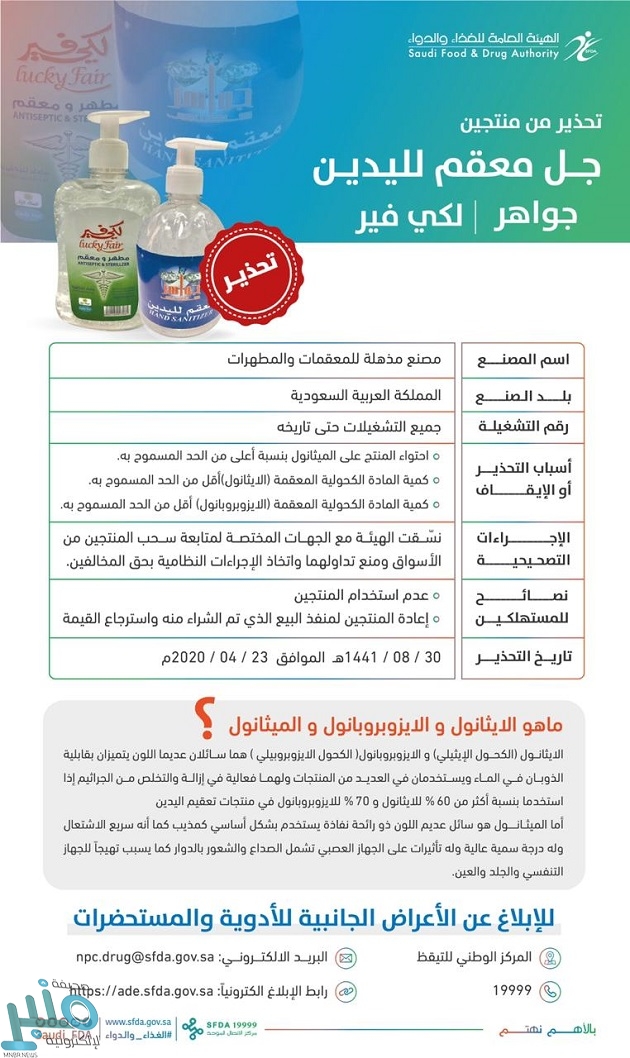 وبيّنت الهيئة أن تحاليلها أثبتت أن منتج الجل المعقم لليدين “Lucky Fair” الذي ينتجه مصنع مذهلة للمعقمات والمطهرات يحتوي على مادة الكحول الميثيلي (ميثانول) وكمية أقل من الحدود المسموح بها من المواد الكحولية المعقمة “إيثانول” و”ايزوبروبانول”، ما يؤدي إلى ضُعف فاعلية المنتج في تعقيم اليدين.