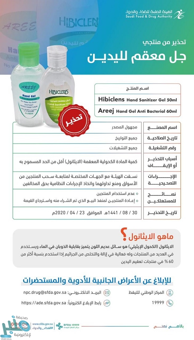 وذكرت أن منتج جل ” Areej Hand Gel Anti Bacterial ” الذي تنتجه جهة مجهولة المصدر يحتوي على كميات أقل من الحدود المسموح بها من المادة الكحولية المعقمة إيثانول، ما يؤدي إلى ضُعف فاعلية المنتج في تعقيم اليدين.