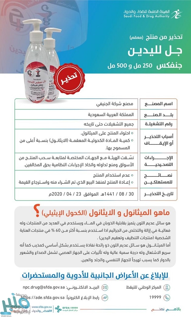 وأوضحت الهيئة أنها حلّلت عينات من معقمات اليدين المتداولة في الأسواق المحلية للتأكد من سلامتها ومطابقتها للمواصفات المعتمدة، وثبت احتواء منتج جل “جنفكس” الذي ينتجه مصنع شركة الجنيفي على نسبة عالية من الكحول الميثيلي (ميثانول)، مشيرة إلى أن التعرض لهذه المادة بنسبة أعلى من المسموح بها قد يسبب مخاطر صحية للمستهلك، كما تبين احتواء المنتج على كميات أقل من الحدود المسموح بها من المادة الكحولية المعقمة “إيثانول”، ما يؤدي إلى ضُعف فاعلية المنتج في تعقيم اليدين.