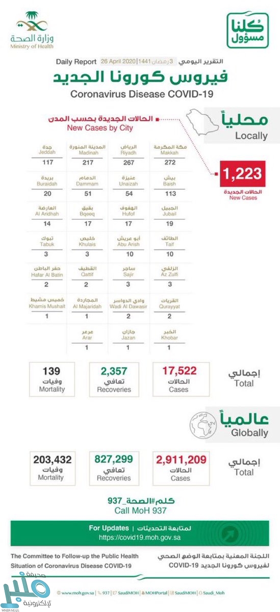 أعلن المتحدث الرسمي باسم وزارة الصحة الدكتور محمد العبد العالي عن تسجيل (1223) حالة إصابة جديدة بفيروس #كورونا الجديد (كوفيد19)، وتسجيل (3) حالات وفيات رحمهم الله، وتسجيل (142) حالة تعافي ليصبح إجمالي عدد الحالات المتعافية (2357) حالة ولله الحمد.