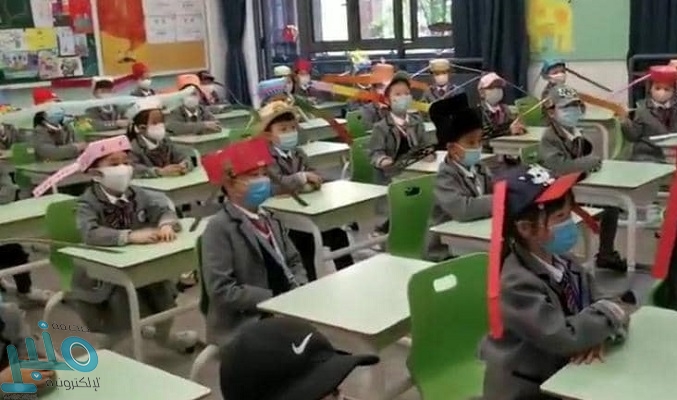 وحسبما يظهر في مقطع فيديو التقط من داخل فصل، بمدرسة ابتدائية في مدينة هانغزو التابعة لمقاطعة زيجيانغ شرقي الصين، فقد أجبر الطلاب على ارتداء قبعات مزودة بشرائط جانبية، لتنبيههم بضرورة التباعد عن بعضهم البعض.