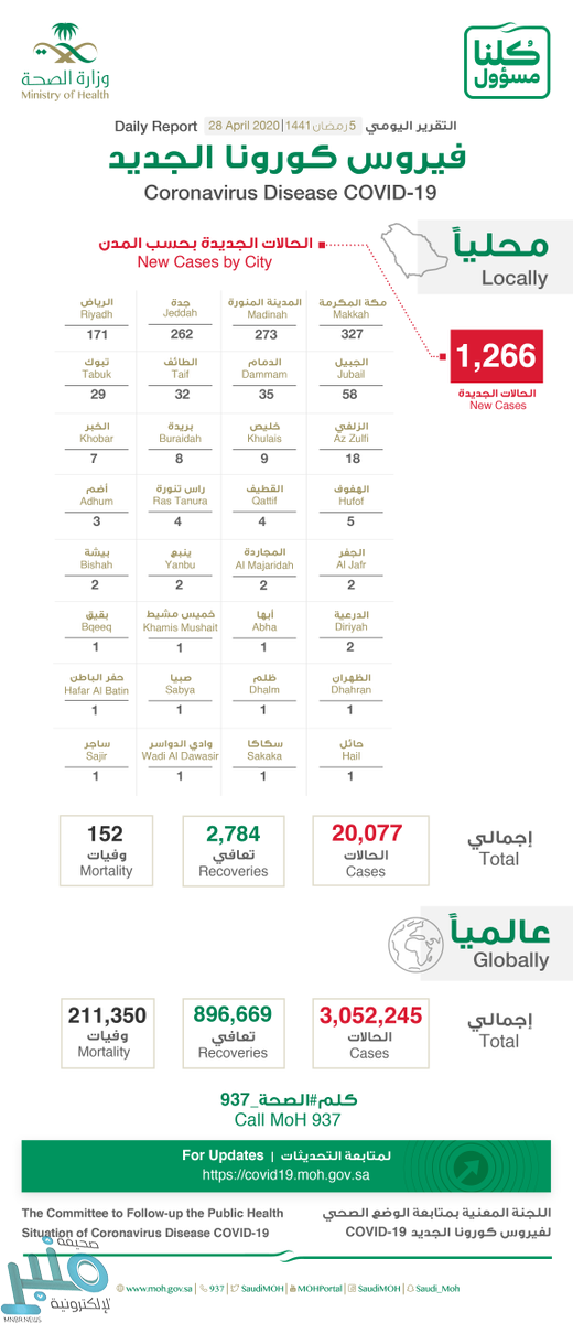 وسجلت ” الجفر – المجاردة – ينبع – بيشة – الدرعية ” حالتي إصابة بكل منهم فيما سجلت ” أبها – خميس مشيط – بقيق – الظهران – ظلم – صبيا – حفر الباطن – حائل – سكاكا – وداي الدواسر – ساجر” حالة إصابة واحدة بكل منهم .