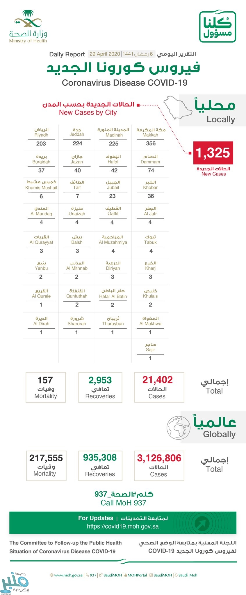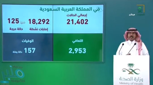 عقد المتحدث الرسمي لوزارة الصحة المؤتمر الصحفي حول الإيجاز الصحفي اليومي حول مستجدات فيروس كورونا في المملكة، وأعلن عن تسجيل (1325 ) حالة جديدة بفايروس كورونا وذلك خلال الـ 24 ساعة الماضية، وبهذا يصل العدد الاجمالي لجميع المصابين في المملكة(21402)؛ من بينهما (18292) حالة نشطة،معظمها مستقرة و(115)حالة حرجة تتلقى الرعاية الصحية المركزة.