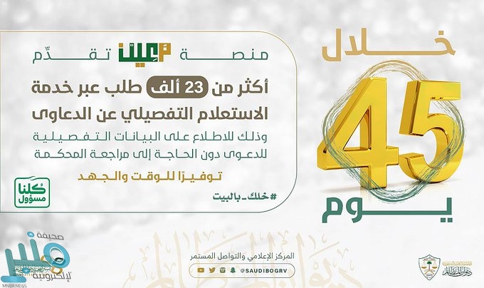 أسهمت الخدمات الإلكترونية التي توفرها منصة معين بديوان المظالم، في تعزيز كفاءة العمل القضائي عن بعد، ومنها خدمة الاستعلام التفصيلي عن الدعوى، حيث سجلت خلال الفترة الماضية من تاريخ 21/ 7/ 1441هـ وحتى 7/ 9/ 1441هـ، ما يصل إلى 23216 خدمة إلكترونية منفذة.