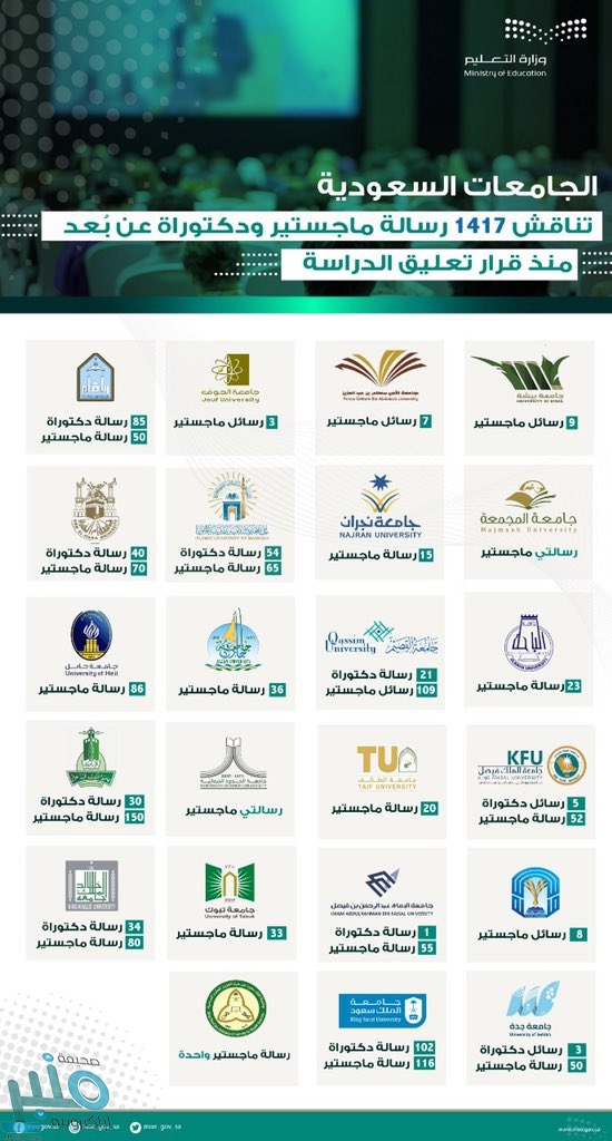 أعلنت جامعة الطائف، اليوم، إتمام مناقشة 20 رسالة ماجستير افتراضياً “عن بُعد”، منذ صدور قرار تعليق الدراسة في الجامعات ومدارس التعليم العام.