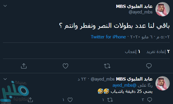 ونشر “العليوي” تغريدة ساخرة عبر حسابه الشخصي على مواقع التواصل الاجتماعي تويتر قائلًا: “باقي لنا عدد بطولات النصر ونفطر وانتم ؟”.