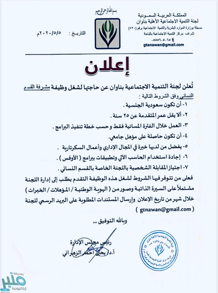 أعلنت لجنة التنمية الاجتماعية في مركز ناوان بمحافظة المخواة عن حاجة اللجنة لشغل وظيفة سكرتير، ووظيفة مشرفة القسم النسائي.