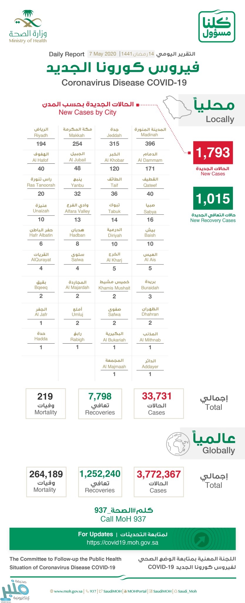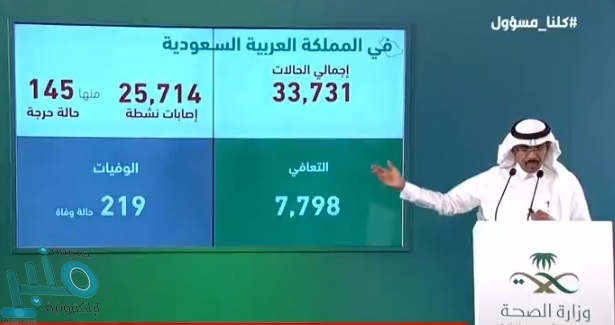وأضاف متحدث “الصحة” الدكتور محمد العبدالعالي، خلال المؤتمر الصحفي الدوري للحديث عن آخر مستجدات فيروس “كورونا” أن إجمالي الحالات في المملكة وصل إلى 33731 حالة حتى الآن ، بينها 25714 حالة نشطة، منها 145 حرجة تتلقى الرعاية المناسبة.