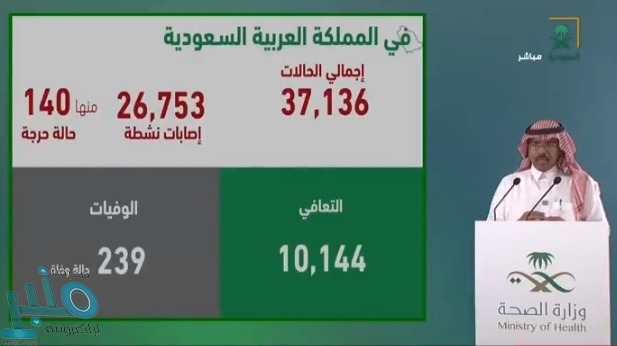 وأضاف متحدث “الصحة” الدكتور محمد العبدالعالي، خلال المؤتمر الصحفي الدوري للحديث عن آخر مستجدات فيروس “كورونا” أن إجمالي الحالات في المملكة وصل إلى 37136 حالة حتى الآن ، بينها 26753 حالة نشطة، منها 140 حرجة تتلقى الرعاية المناسبة.