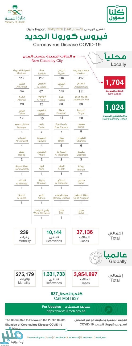 وجاء توزيع الحالات الجديدة المصابة بفيروس كورونا: حسب الجنسية” 30 ٪ سعوديين ، 70 ٪ غير سعوديين” ، وبحسب الفئة العمرية ” 6 ٪ أطفال، 4 ٪ كبار، 90 ٪ بالغين” ، وبحسب الجنس ” 18 ٪ إناث، 82 ٪ ذكور”.