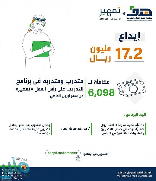 أودع صندوق تنمية الموارد البشرية “هدف”، 17.240.500 مليون ريال مكافأة لـ 6.098 متدربًا ومتدربة في برنامج التدريب على رأس العمل “تمهير”، وذلك عن شهر أبريل الماضي.