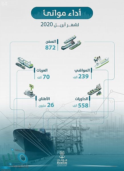 ووفقاً للمؤشر الإحصائي الصادر من الهيئة العامة للموانئ، فقد بلغ عدد السفن التي استقبلتها الموانئ السعودية خلال نفس الشهر 872 سفينة، وبلغ عدد العربات 70 ألف عربة، بينما بلغ عدد المواشي 239 ألف رأس من الماشية.