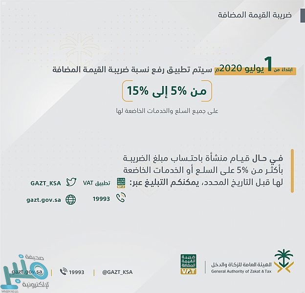 أكدت الهيئة العامة للزكاة والدخل أن رفع نسبة ضريبة القيمة المضافة من 5% إلى 15% على جميع السلع والخِدْمات الخاضعة لها سيكون في الأول من شهر يوليو 2020م.