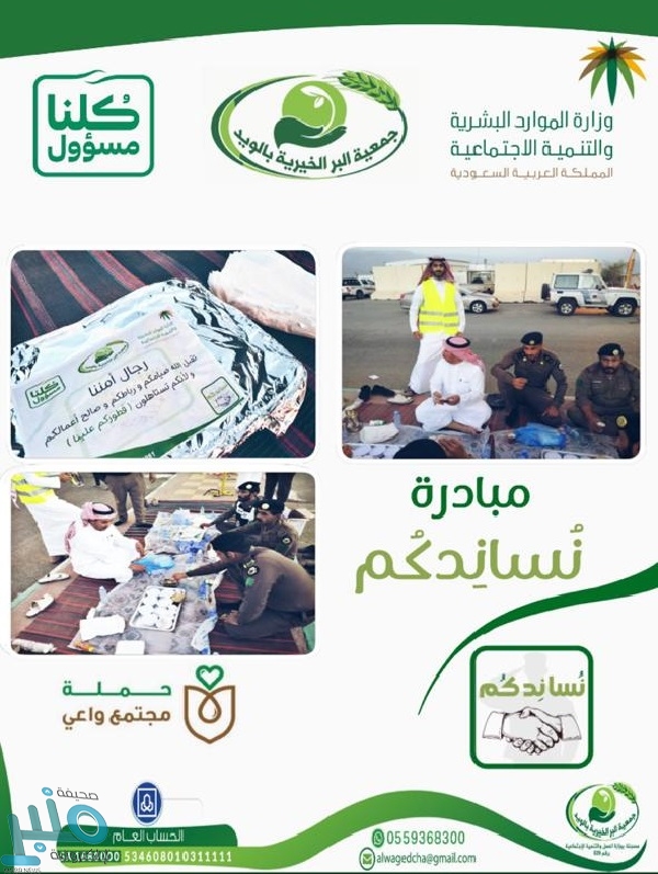 كما قامت جمعية البر الخيرية بمركز الويد، بتنفيذ مشروع مساندة وتوزيع السلال الغذائية للمستفيدين المتضررين من أزمة كورونا، بدعم من (مؤسسة سليمان بن عبدالعزيز الراجحي الخيرية)، كما قامت الجمعية بمبادرة (نساندكم) وهي إحدى المبادرات التي قامت بها جمعية البر الخيرية بالويد لشهر رمضان ١٤٤١هـ التي تهدف الى تقديم وجبة الإفطار لرجال الأمن المرابطين في الميدان تحت شعار “لأنكم تستاهلون .. فطوركم علينا”.