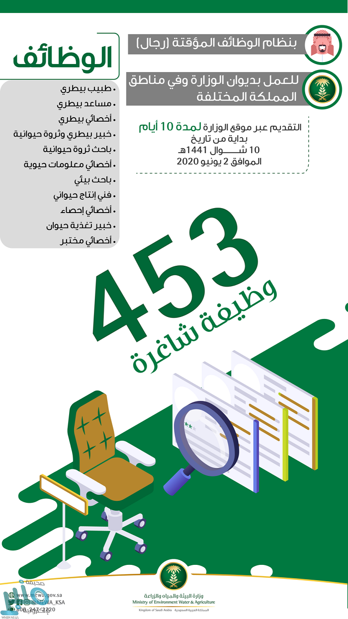 أعلنت وزارة البيئة والمياه والزراعة، عن توفر 453 وظيفة شاغرة للسعوديين (رجال)، للعمل بديوان الوزارة في مناطق المملكة المختلفة، وذلك لشغلها بنظام الوظائف المؤقتة.