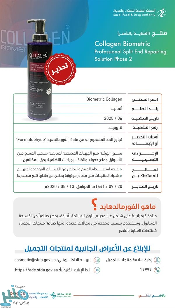 حذرت الهيئة العامة للغذاء والدواء من تداول واستعمال منتجين للعناية بالشعر، لاحتوائهما نسبة عالية من مادة “الفورمالدهايد”، تُجاوز الحد المسموح به في لائحة متطلبات السلامة في مستحضرات التجميل والعناية الشخصية.