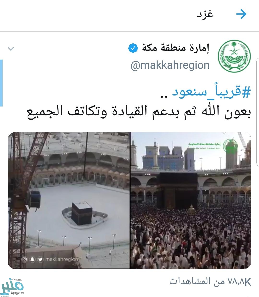 غرد الحساب الرسمي لإمارة منطقة مكة المكرمة، اليوم الجمعة، بمقطع فيديو للحرم المكي الشريف في نصفه يبدو صحن الطواف بالحرم خاليًا وفي النصف الآخر يكتظ بالطائفين وكتب حساب الإمارة عبارة: “‏‎قريباً سنعود .. بعون الله ثم بدعم القيادة وتكاتف الجميع”.