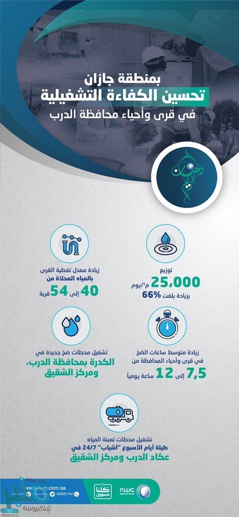 حققت الإدارة العامة لخدمات المياه في منطقة جازان، خلال شهر رمضان الحالي، نسبة زيادة في توزيع المياه المحلاة، وتغطية أحياء وقرى محافظة الدرب بلغت 66%، وذلك ضمن خطط رفع الكفاءة التشغيلية، وتحسين مستوى الخدمات المقدمة التي تسعى الإدارة لتحقيقها.