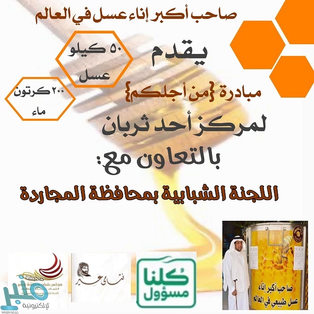 ضمن مبادرة “نشامى عسير” التي أطلقها صاحب السمو الملكي الأمير تركي بن طلال بن عبدالعزيز أمير منطقة عسير للحد من تفشي جائحة كورونا، وضمن المبادرات المجتمعية لمحافظة المجاردة، وتحت إشراف محافظ المجاردة سعيد بن علي بن دلبوح، ومتابعة منسق مبادرات محافظة المجاردة علي بن حنفان العمري، وبإشراف مباشر ومتابعة من رئيس مركز أحد ثربان عبدالمجيد بن عثمان الشهراني، نفذ صاحب أكبر إناء عسل طبيعي في العالم محمد عبده الشهري “أبو نورة”، وعلي عبدالله الشهري مبادرة «من أجلكم» لعسل تهامة، بالتعاون مع اللجنة الشبابية بمحافظة المجاردة، وذلك بتوزيع 50 كيلوجرامًا من أجود أنواع العسل الطبيعي “عسل تهامة”، إضافة إلى 200 كرتون من المياه، مساهمة لأهالي مركز أحد ثربان.