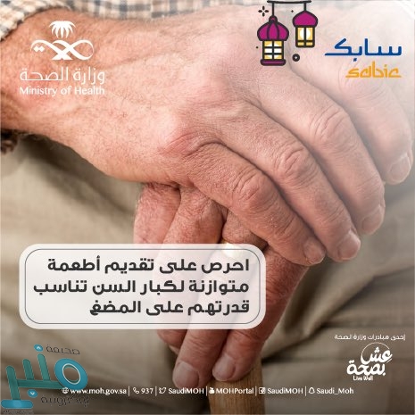 ونصحت الوزارة، عبر منصتها للتوعية “عش بصحة” وحسابها في “تويتر” كافة أفراد المجتمع بمختلف فئاتهم وشرائحهم بالحرص على تقديم أطعمة متوازنة لكبار السن تناسب قدرتهم على المضغ.
