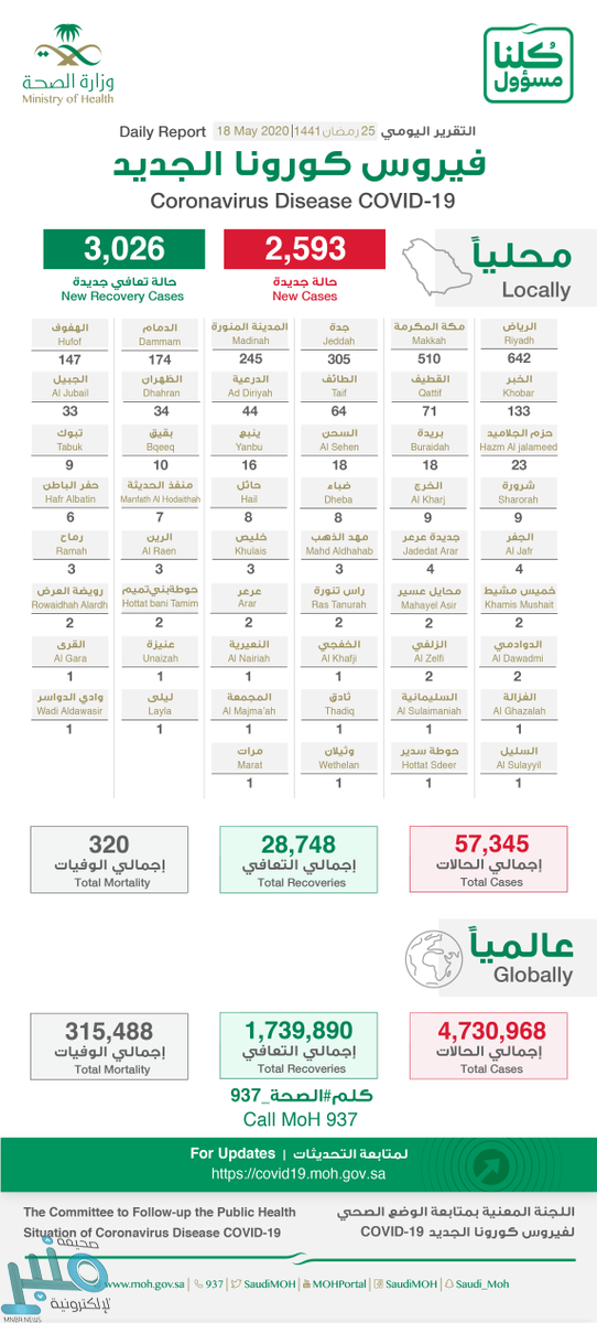وجاء توزيع الحالات الجديدة المصابة بفيروس كورونا: حسب الجنسية ” 44 ٪ سعوديين ، 56 ٪ غير سعوديين” ، وبحسب الفئة العمرية ” 11 ٪ أطفال، 3 ٪ كبار، 86 ٪ بالغين” ، وبحسب الجنس ” 25 ٪ إناث، 75 ٪ ذكور”.