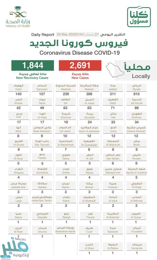 وجاء توزيع الحالات الجديدة المصابة بفيروس كورونا: بحسب الجنسية ” 40 ٪ سعوديين ، 60 ٪ غير سعوديين” ، وبحسب الفئة العمرية ” 10 ٪ أطفال، 3 ٪ كبار، 87 ٪ بالغين” ، وبحسب الجنس ” 26 ٪ إناث، 74 ٪ ذكور”.