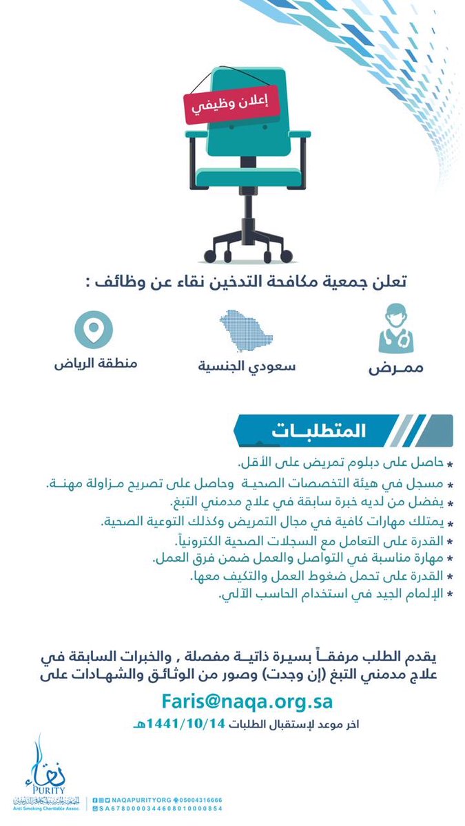 الجمعية الخيرية لمكافحة التدخين (نقاء) توفر وظائف إدارية وصحية للجنسين