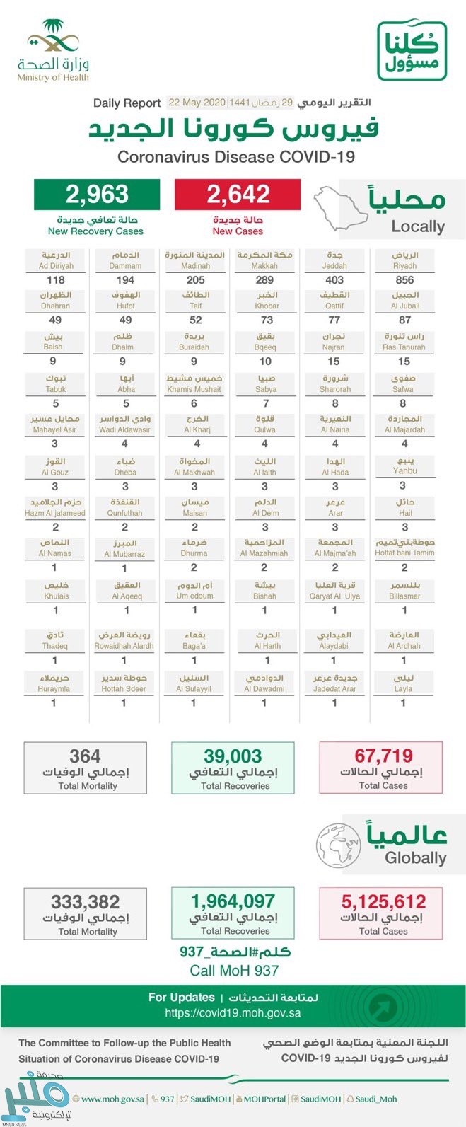 أعلنت وزارة الصحة، اليوم الجمعة ، عن تسجيل 2642 إصابة جديدة بفيروس “كورونا” .
