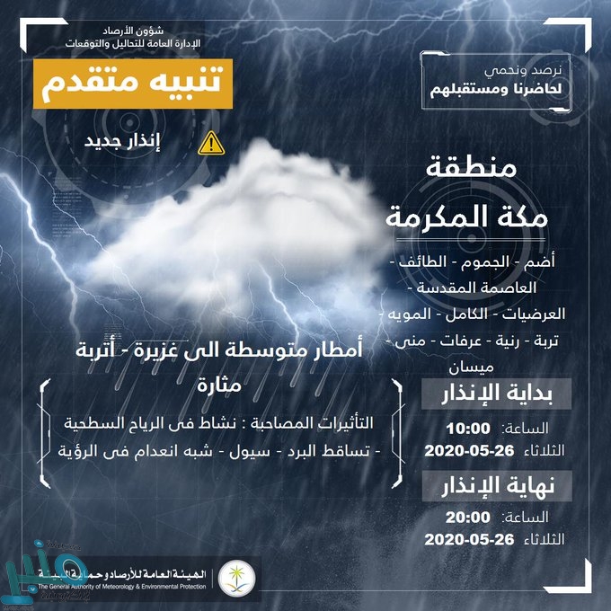 أصدرت الهيئة العامة للأرصاد وحماية البيئة ممثلة في الإدارة العامة للتحاليل والتوقعات اليوم تنبيهاً يتضمن هطول أمطار رعدية على عددٍ من محافظات منطقة مكة المكرمة تشمل: أضم، والجموم ، والطائف، والعاصمة المقدسة، والعرضيات، وميسان، والكامل، وميسان، وتربة، ورنية، وعرفات، ومنى، مصحوبة بنشاط في الرياح السطحية وتساقط للبرد، وجريان للسيول، وشبه انعدام للرؤية الأفقية.