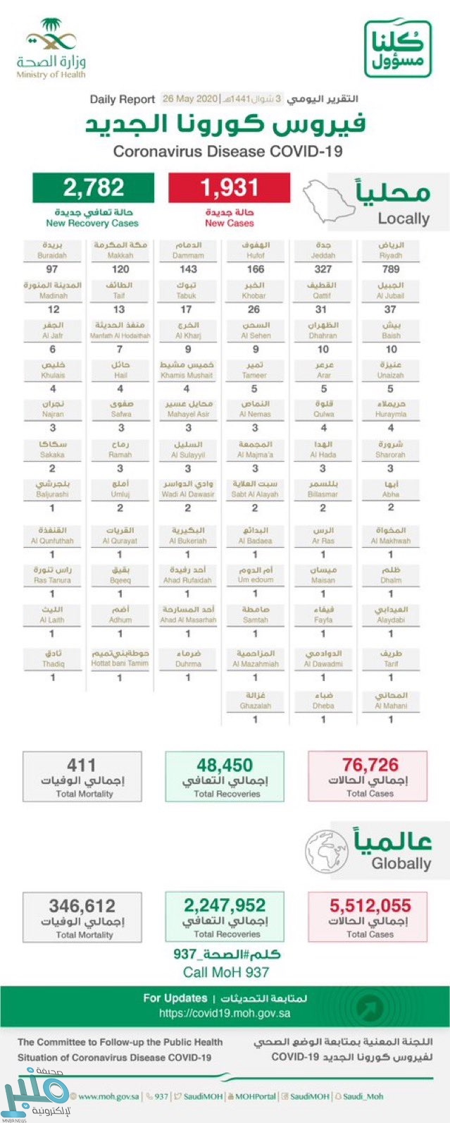 وأضاف متحدث “الصحة” الدكتور محمد العبدالعالي، خلال المؤتمر الصحفي الدوري للحديث عن آخر مستجدات فيروس “كورونا” أن إجمالي الحالات في المملكة وصل إلى 76726 حالة حتى الآن ، بينها 27865 حالة نشطة، منها 397 حالة حرجة تتلقى الرعاية المناسبة.