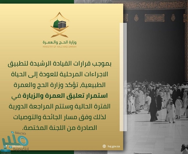 أكدت وزارة الحج والعمرة، استمرار تعليق العمرة والزيارة خلال الفترة الحالية، مشيرة إلى وجود مراجعة دورية لهذا القرار وفقًا لتطورات جائحة كورونا.