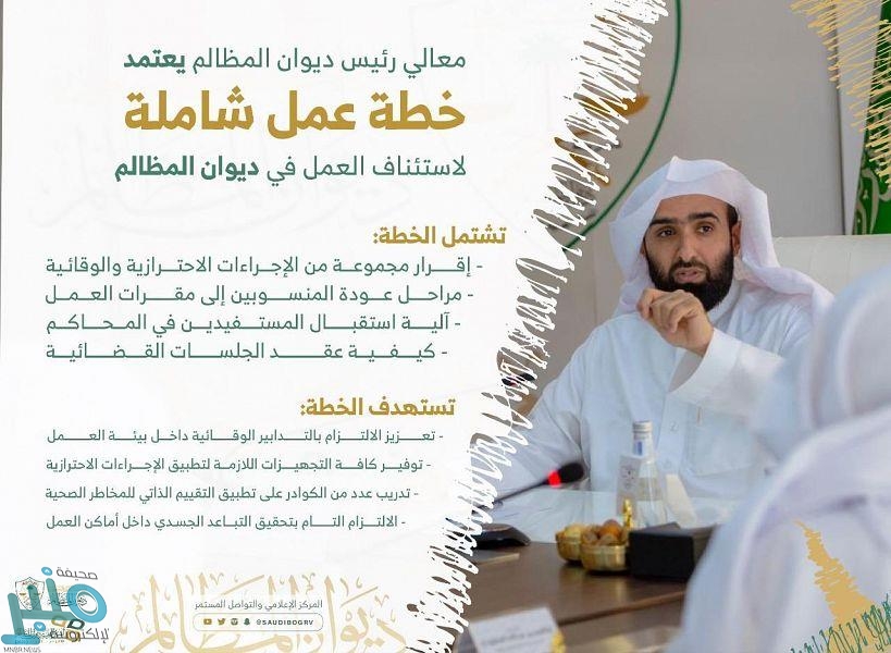 وشددت الخطة على أنه يقتصر الدخول لمقر ديوان المظالم ومحاكمه على منسوبيه كمرحلة أولى، إلى جانب مجموعة من الاحتياطات الوقائية داخل بيئة العمل مواكبةً للتعليمات الصحية الصادرة عن وزارة الصحة.