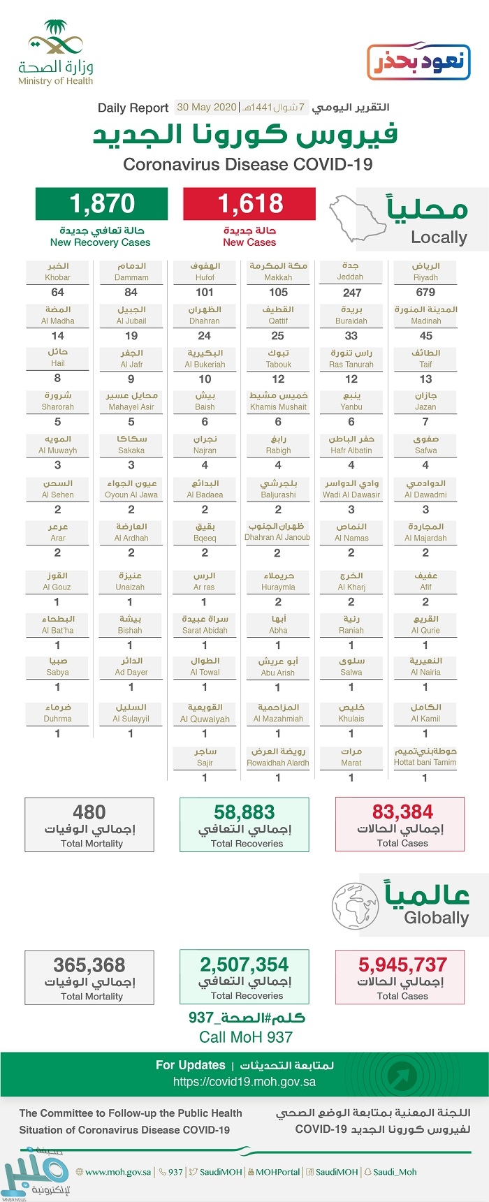 وأضافت الصحة أن إجمالي الحالات في المملكة وصل إلى 83384 حالة حتى الآن .