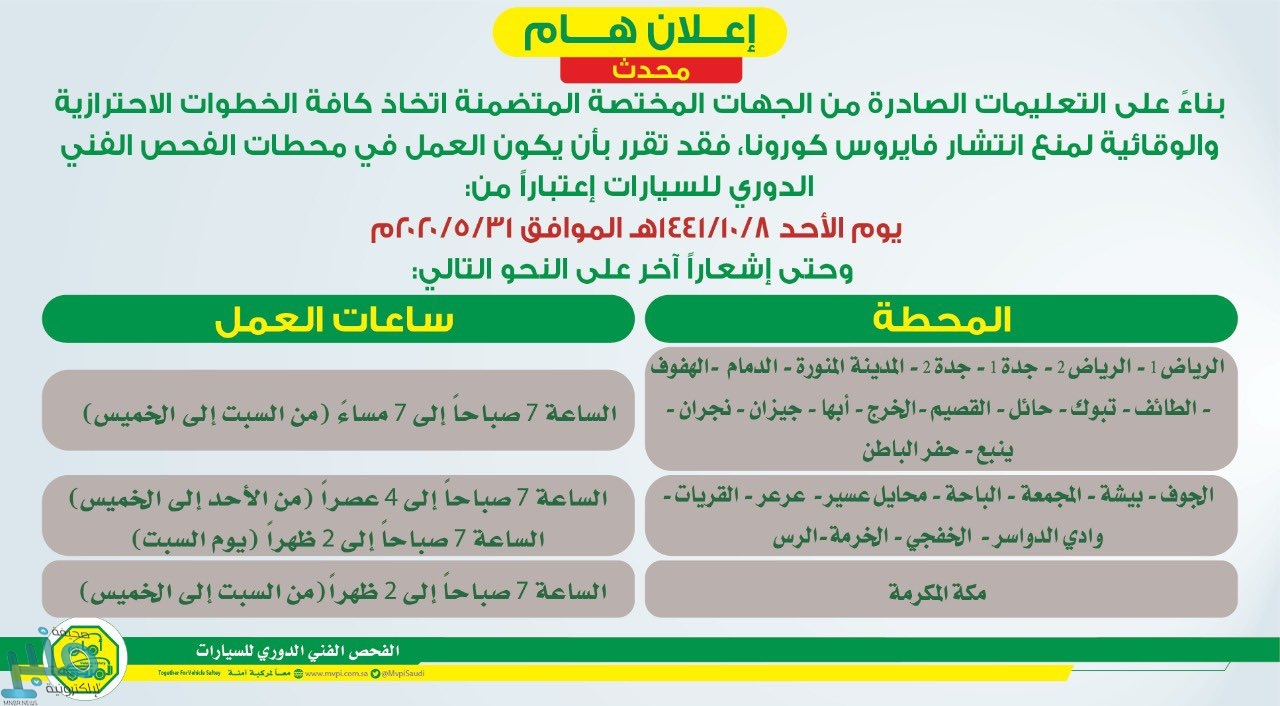 أعلنت الإدارة العامة للفحص الفني الدوري للسيارات، أوقات العمل في محطات الفحص في جميع مناطق المملكة ابتداءً من اليوم (الأحد) 8 شوال.