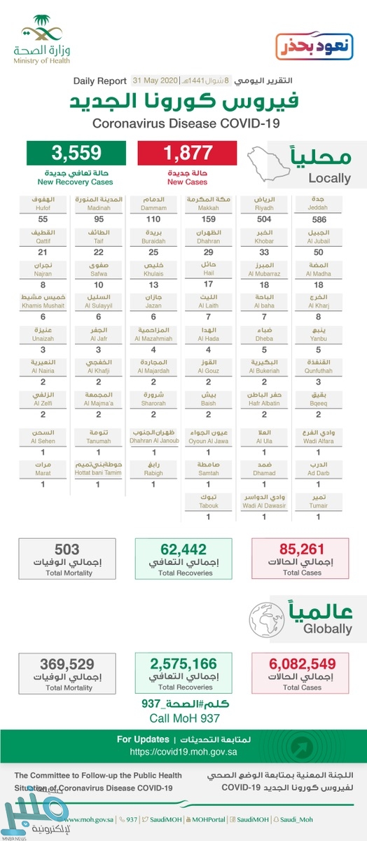 وأضافت الوزارة في البيان الصحفي اليومي حول مستجدات فيروس كورونا بالمملكة: أن إجمالي الإصابات بكورونا ارتفع إلى 85.261 حالة.