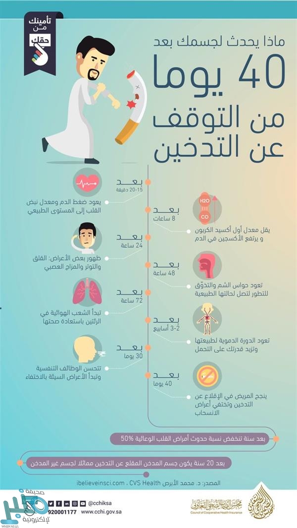 أبرز مجلس الضمان الصحي التعاوني النتائج والتطورات الإيجابية التي تحدث بجسم المدخن، والتي يبدأ تأثيرها في الظهور بعد 20 دقيقة فقط من الامتناع عن التدخين.