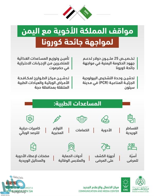 وأوضحت الوزارة بعض جوانب الدعم المقدم من المملكة لليمن لمواجهة الجائحة، منها تقديم دعم بمبلغ 25 مليون دولار، بجانب تخصيص وحدة التشخيص البيولوجية الجزئية المناعية “PCR” بمدينة سيئون، وتدشين مركز الطوارئ لمكافحة الوبائيات والعيادات الطبية المتنقلة بمحافظة حجة.