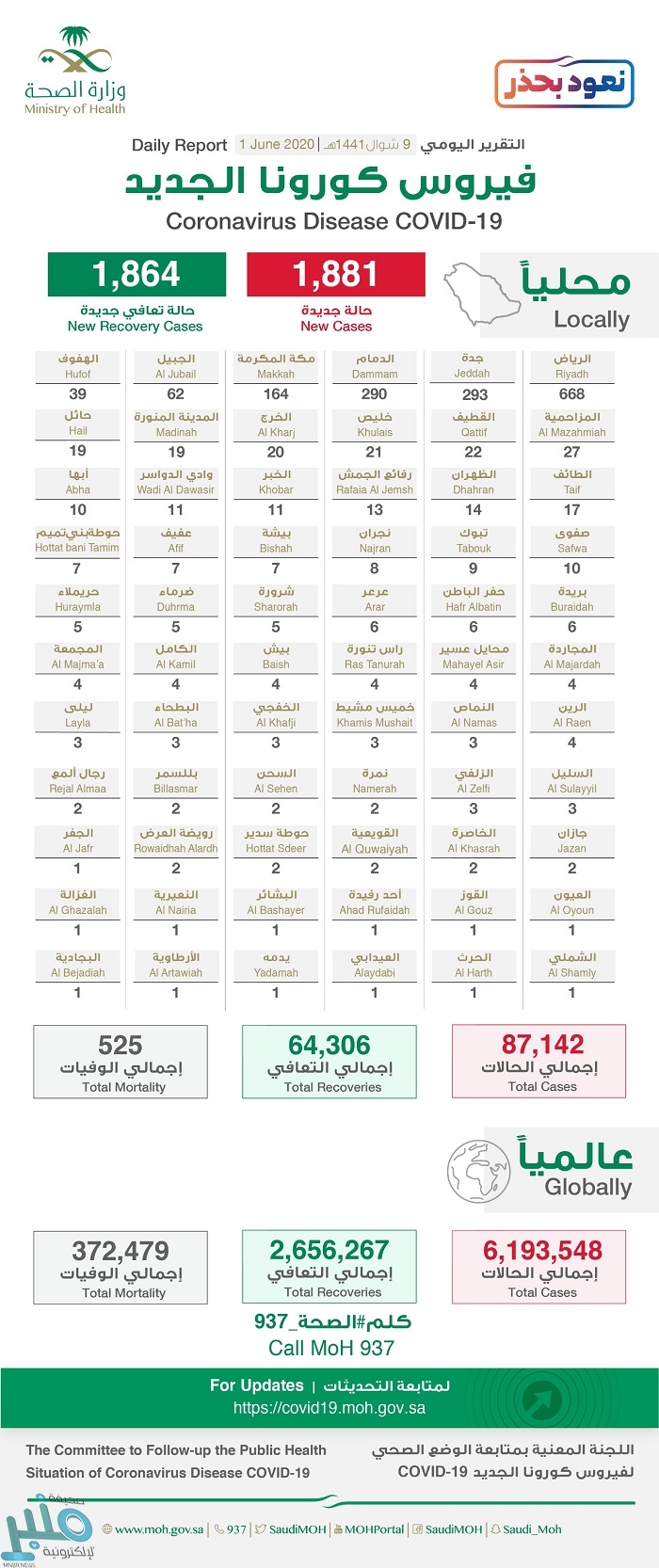 وأضافت الوزارة في البيان الصحفي اليومي حول مستجدات فيروس كورونا بالمملكة: أن إجمالي الإصابات بكورونا ارتفع إلى 87142 حالة.