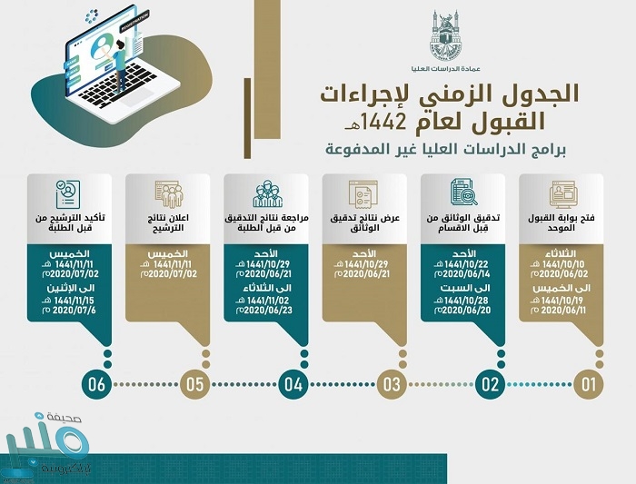 وأوضح عميد الدراسات العليا د. سليمان السعيد، أن برامج الدراسات العليا غير المدفوعة تتماشى مع التدابير الوقائية التي اتخذتها الدولة -أعزها الله- للتصدي لجائحة كورونا؛ حيث قامت العمادة بإلغاء الاختبار التحريري لمتقدمي مرحلة الدكتوراه لهذا العام، وأضاف أن الجدول الزمني لإجراءات القبول يمرُّ -بعد فتح بوابة القبول- بعدة مراحل، بدءًا بتدقيق الوثائق وعرض نتائجها، ومراجعة الطلبة لتلك النتائج، وإعلان الترشيح، نهايةً بتأكيد الطلبة المرشحين لإتمام إجراءات القبول.