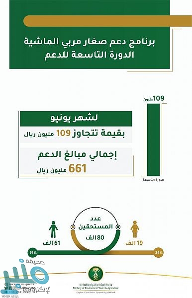 أعلنت وزارة البيئة والمياه والزراعة عن تلقي أكثر من 80 ألف مستفيد من برنامج دعم صغار مربي الماشية لـ109 ملايين ريال في حساباتهم البنكية المسجلة في بوابة “أنعام”، وذلك ضمن دورة الاستحقاق التاسعة لبرنامج الإعانات الزراعية.